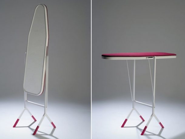 熨衣板通常只占地方,不用的时候就放在那里。嗯,这个可以变成一面镜子,这样你熨完衣服就可以在它前面准备了。