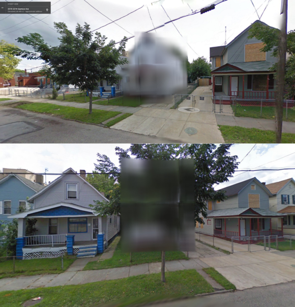 这个审查图像是Ariel卡斯特罗之家,把三个女人囚禁在了十多年,直到他们逃脱2013年5月。三个月后的房子被拆除,但依然模糊和街道视图的天线。