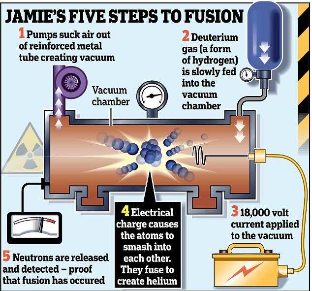 杰米一直对辐射很感兴趣,有一次他甚至用圣诞节的钱买了一个盖革计数器。2008年,14岁的泰勒·威尔逊(Taylor Wilson)在内华达州的学校里成为了最年轻的制造聚变反应堆的人。他读了泰勒·威尔逊的故事,激发了他制造聚变反应堆的愿望。