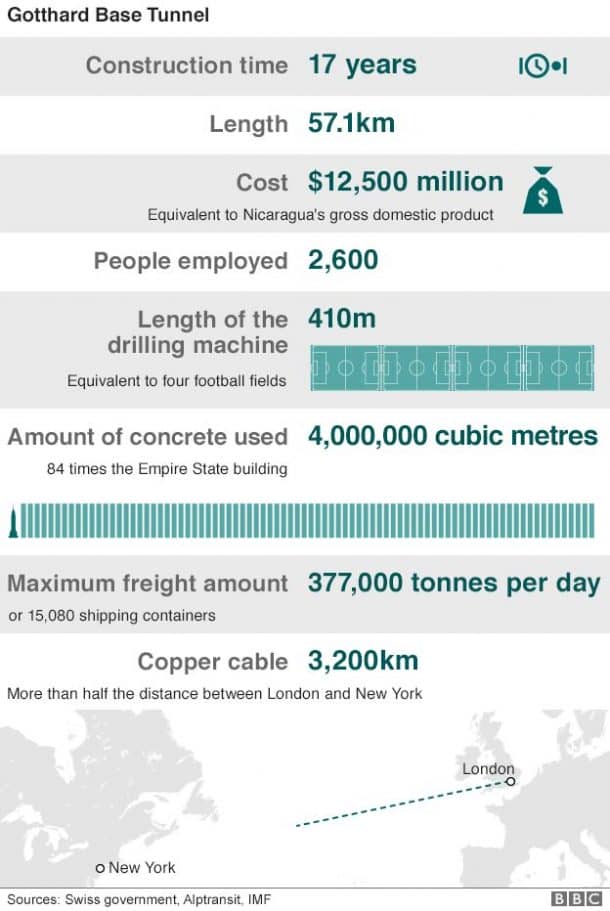 这个想法从1947年就开始考虑,但18年前就开始动工了。该项目耗资超过120亿美元(83亿英镑),并在1992年的一次全民公决中获得了瑞士选民的支持。
