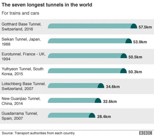 看起来日本不再拥有世界最长铁路隧道的头衔了,因为瑞士刚刚开放了圣哥达基地隧道(GBT)。该隧道长35.4英里,位于圣哥达山下7545英尺处,穿过瑞士阿尔卑斯山。据称,该隧道将在瑞士阿尔卑斯山脉下提供连接北欧和南欧的高速铁路。