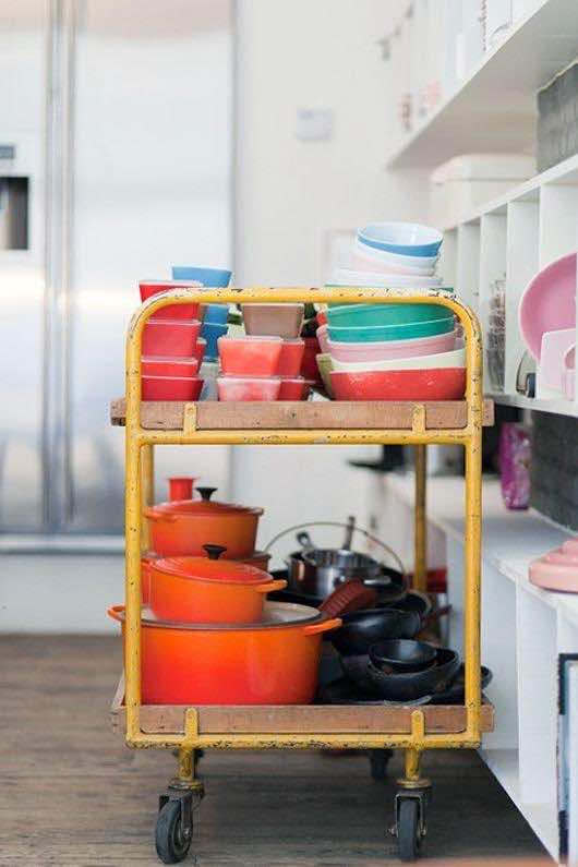 清空你的橱柜,把烹饪用具搬到储物车里,储物车很有用,因为它是可移动的,可以很容易地推出厨房,获得更多的空间。