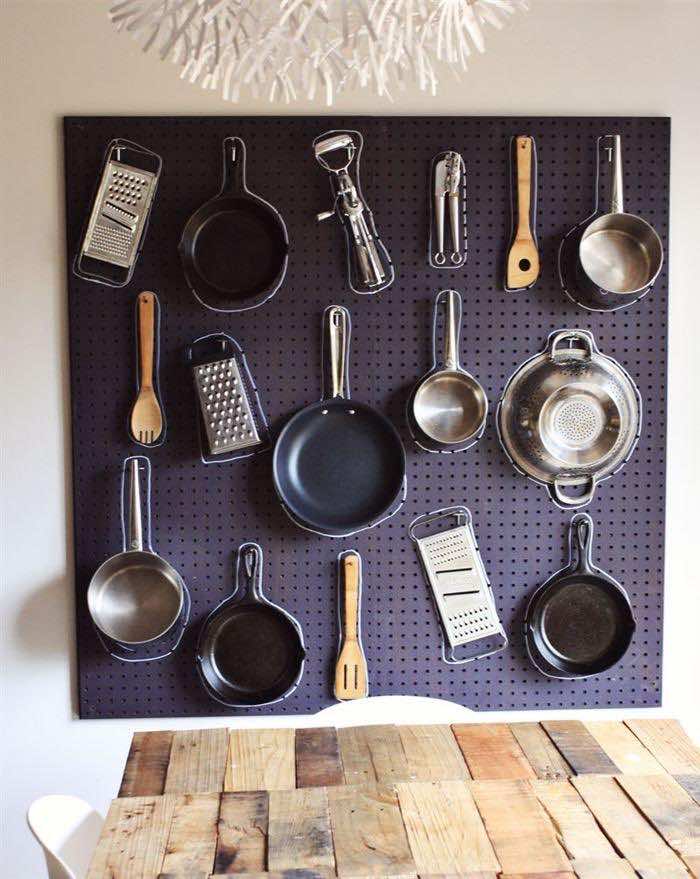 使用钉板非常有助于释放存储空间,你所需要的只是把锅、锅甚至勺子挂在钉板上,腾出一些存储空间。