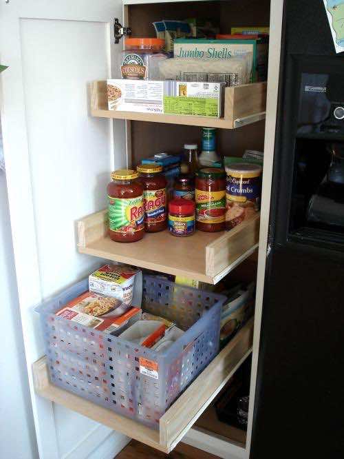 使用橱柜门挂篮子,并利用它们。这样可以最大限度地利用存储空间。