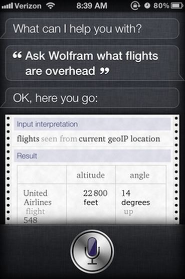 人们可能会认为你只需要说“飞机开销”或“上面我是什么飞机?“但这并不是正确的。正确的说法是,“问Wolfram航班开销。”