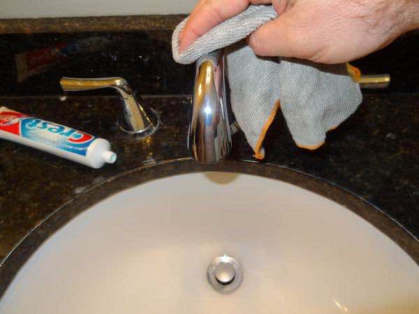 当你注意到镀铬水龙头上到处都是水点时,使用牙膏,用一块软布轻轻地在镀铬水龙头上擦拭,然后冲洗掉。这将适用于任何铬,从管道装置到汽车车轮。偶尔使用这个技巧,因为牙膏中的磨料会逐渐磨损完成。