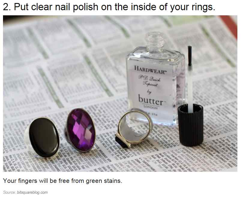 在戒指内涂上透明的指甲油。它可以防止造成手指上的绿色污渍。