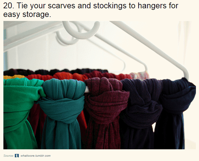 把围巾系在衣架上可以为你的衣橱创造更多的存储空间。