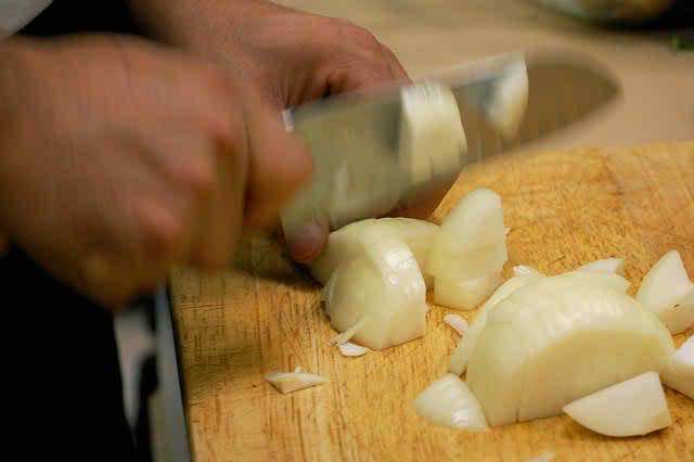 把洋葱放入冷水中浸泡30秒,然后不哭着切成小块。