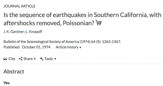 摘要在Twitter上重新浮出水面,因为发明家和科学 - 饰物Cliff Pickover发布了它。令人惊讶的是,J.K。的摘要Gardner和L. Knopoff做得很好。它解释了他们整篇论文的结果。也许还有其他论文,甚至还有较短的摘要,例如“不”,但尚未找到。