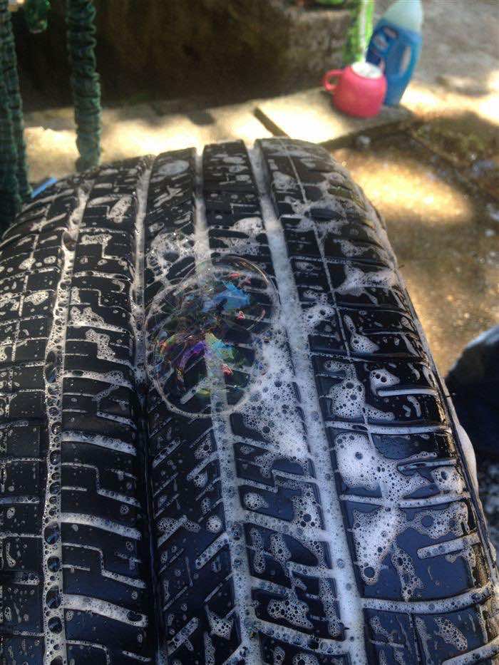 只需在轮胎上涂抹一些洗涤剂,爆发的气泡就会让您找到孔。