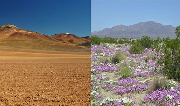 经过很大的雨水,智利的一些沙漠发芽了大量美丽的鲜艳的花朵。