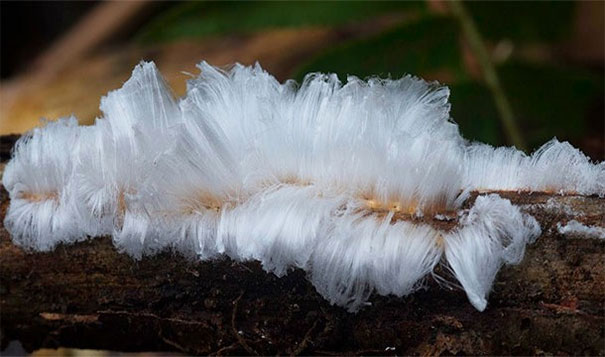 当植物从植物中蒸发水时,头发形冰是在冰冷的天气中形成的。