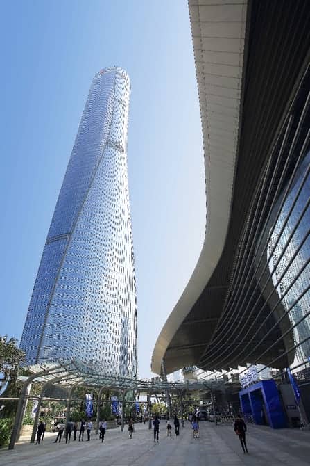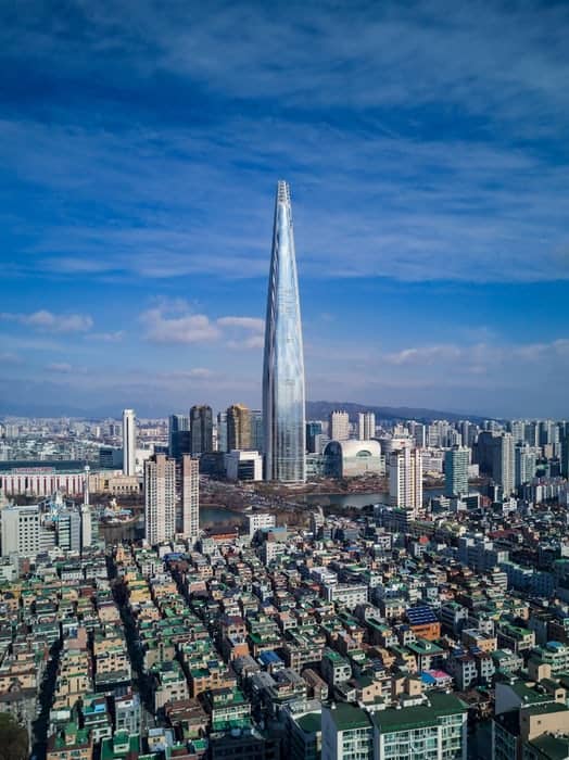 乐天世界塔在首尔,韩国,由KPF再次达到555米的高度(1820英尺),是世界第五高楼。它的设计灵感来源于传统的韩国陶瓷、陶瓷、书法,它拥有世界上最高的玻璃底观景台,这是世界上最快的电梯。