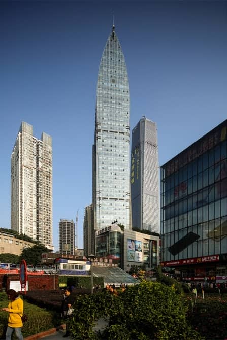中国平安金融中心在深圳,KPF设计(KPF)和在高度599米(1965英尺),是由CTBUH评为世界第四高楼。前面的建筑是雕刻从咸不锈钢保护建设沿海大气和强风。