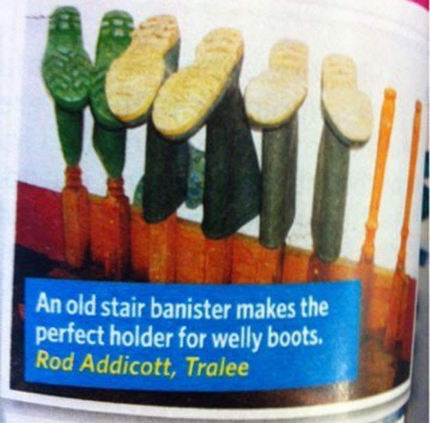 一个古老的楼梯栏杆上可以容纳你的靴子在一个有组织的方式。