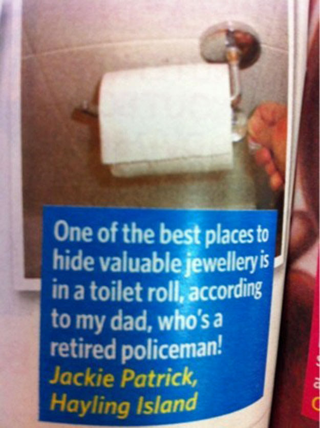 隐藏你的珍贵的东西,没有人能想到的。例如,隐藏你的珠宝在厕纸管。