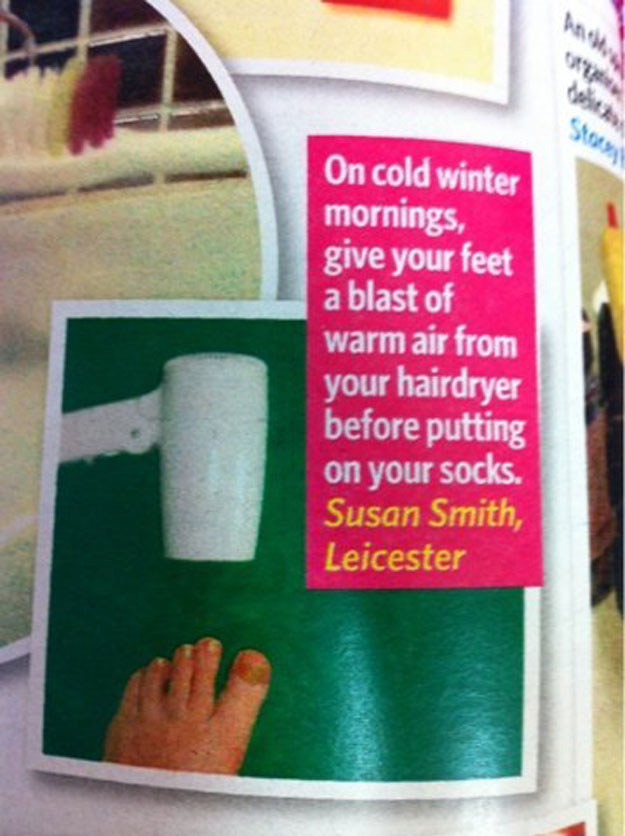 吹吹风机在冬天在你的脚上穿袜子。你将不再感到寒冷。