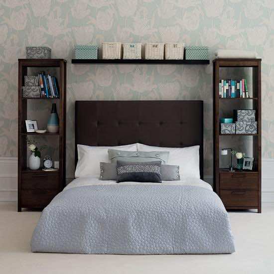 货架转变为床头桌:为了节省房间的地板空间,并在卧室里营造出风气和轻便的感觉,而不是床头柜,使用括号内的架子。