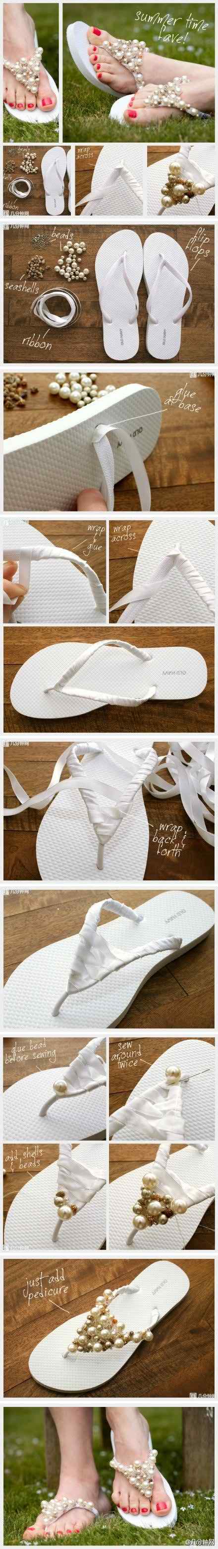 用创新的风格设计你的人字拖。你所需要的只是珍珠、贝壳、珠子和丝带,然后给你的脚穿上最漂亮的人字拖。