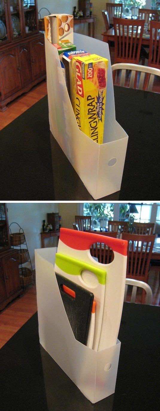 这些厨房必需品可以放在杂志架上垂直堆叠,方便使用!