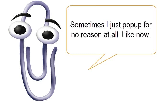 这个讨厌的办公室助理简直就是个讨厌的怪人。如果你没有经历过90年代,你可能都不知道。这个可怜的Clippy总是提供不必要的建议,就像一个在派对上急于求成的人,但没有人想和他说话,但它一直缠着你。它曾经在做了一些愚蠢的观察后提供帮助,比如“看起来你在写信”,就好像你不知道你在写信一样。想象一下,如果你不需要做不懈的努力来关闭这个东西,你会节省多少时间!它不必要地消耗的CPU周期呢?原谅这个是不可能的。