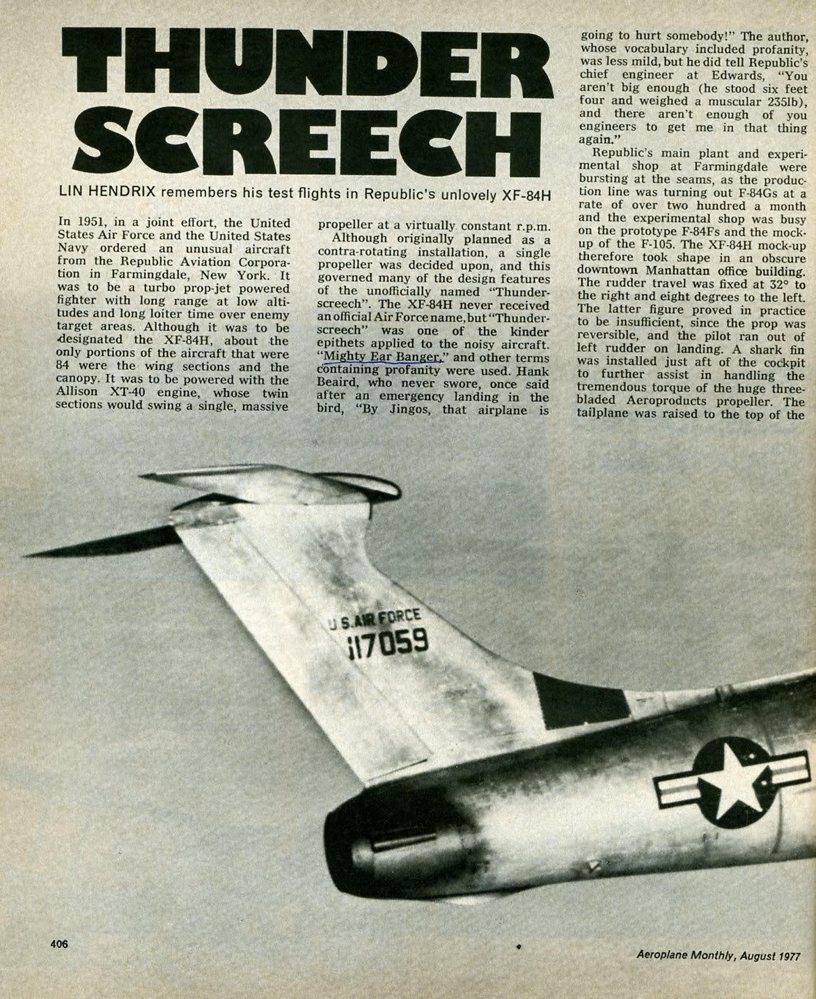 XF-84H是一架实验性涡轮螺旋桨飞机,由涡轮发动机和超音速螺旋桨配合使用提供动力。但由于飞机发动机产生的噪音,在启动时25英里外都能听到,造成严重恶心,使地勤人员耳膜爆裂,导致航班取消。