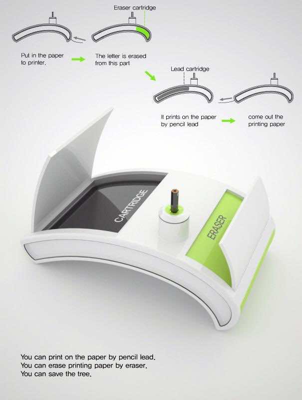 与您的墨水打印机说再见,因为这款概念打印机将使用铅笔打印。这意味着,一旦打印出文档,就可以很容易地擦除和修复该文档中的任何错误,而不是浪费纸张并再次打印整流的文档。打印机还允许重新插入打印的页面并删除所有内容(当然写了铅笔)。