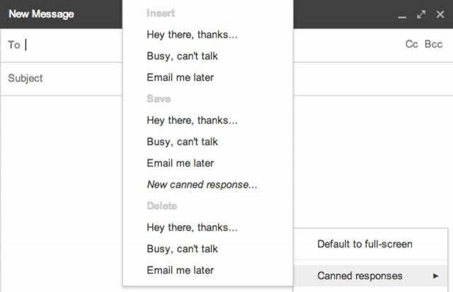 如果您发送具有相同句子的电子邮件,则可以保存它们,然后只需单击即可。转到设置,单击“实验室”选项卡,然后启用“罐头响应”选项。撰写新电子邮件时,消息框的右下角应该有一个小箭头,一旦单击,该箭头将显示列表。