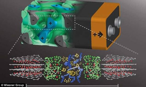 “这确实是革命性的电池架构。”该校工程学教授乌尔里希·威斯纳说。“这种三维架构基本上消除了设备中死容积的所有损失。更重要的是,将这些相互渗透的结构域的尺寸缩小到纳米级,就像我们所做的那样,可以给你更高数量级的功率密度。换句话说,与传统电池架构相比,你可以在更短的时间内获得能量。”