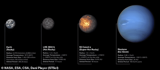 NASA的詹姆斯·韦伯(James Webb)望远镜于2021年12月推出,现在距离地球1,500,000公里。它已经着手关注系外行星的第一个目标,迄今“ 55 Cancri E”和“ LHS 3844”。据说一个浸入熔岩中,表面温度为4400华氏度(2400摄氏度)。另一方面,第二个系外行星,即“ LHS 3844”,没有氛围,比55 cancri e都凉爽。这两种系外行星都属于地球和海王星之间。但是,55 cancri E比LHS 3844大一点,但比海王星小,如下图所示: