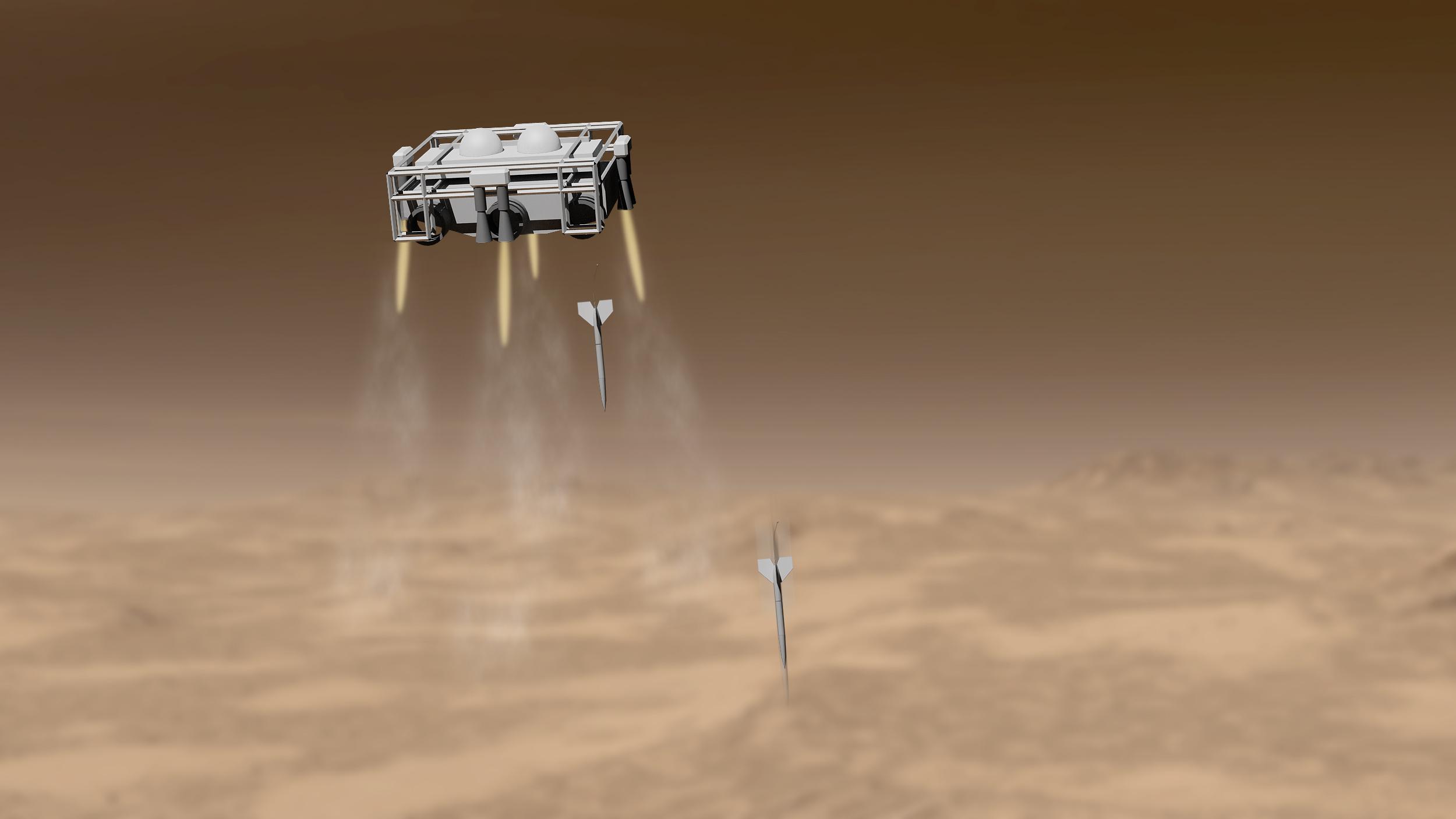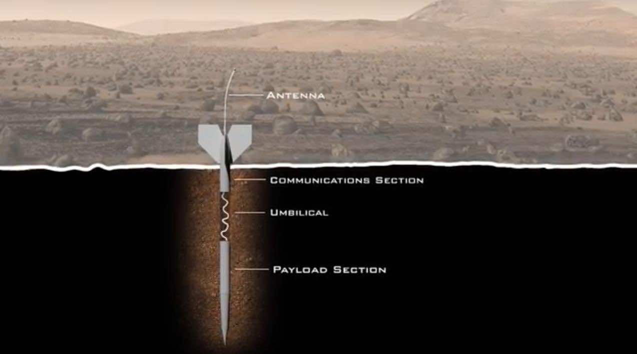 一旦外壳使它火星、颤抖、运载工具,将悬停和拍摄渗透探测器向地面。这些侵入者必称为箭,将小型和轻被启发碉堡克星炸弹早在1991年海湾战争而被创造的。影响,他们将分割成2部分剩下的尾巴在地上而鼻子下潜水有些5米地面,然后将数据发送回的尾巴。实验不仅能确定如果有生命,但还应当承担生命的起源。