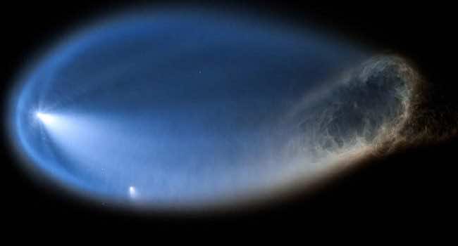 当火箭在黎明或黄昏起飞时,会出现一种被称为“太空水母”的视觉现象。观测者可能处于完全的黑暗中,但当飞行器到达更高的高度时,太阳光线显示出尾随在它后面的气体羽流。这种效果类似于水母的铃铛和触须。