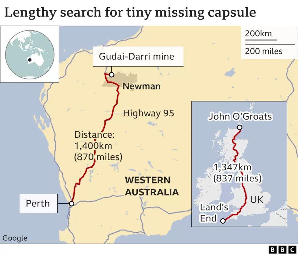 紧急寻找设备,大小的豌豆,正在沿着1400公里(870英里)的路线。胶囊包含少量的放射性铯- 137,这可能会导致严重的疾病的人接触。这可能包括皮肤损伤、烧伤或辐射病。