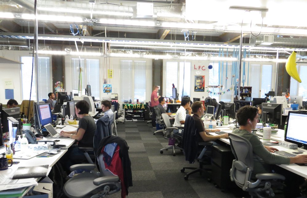 员工们在长桌子和开放式大厅里工作。没有私人办公室。