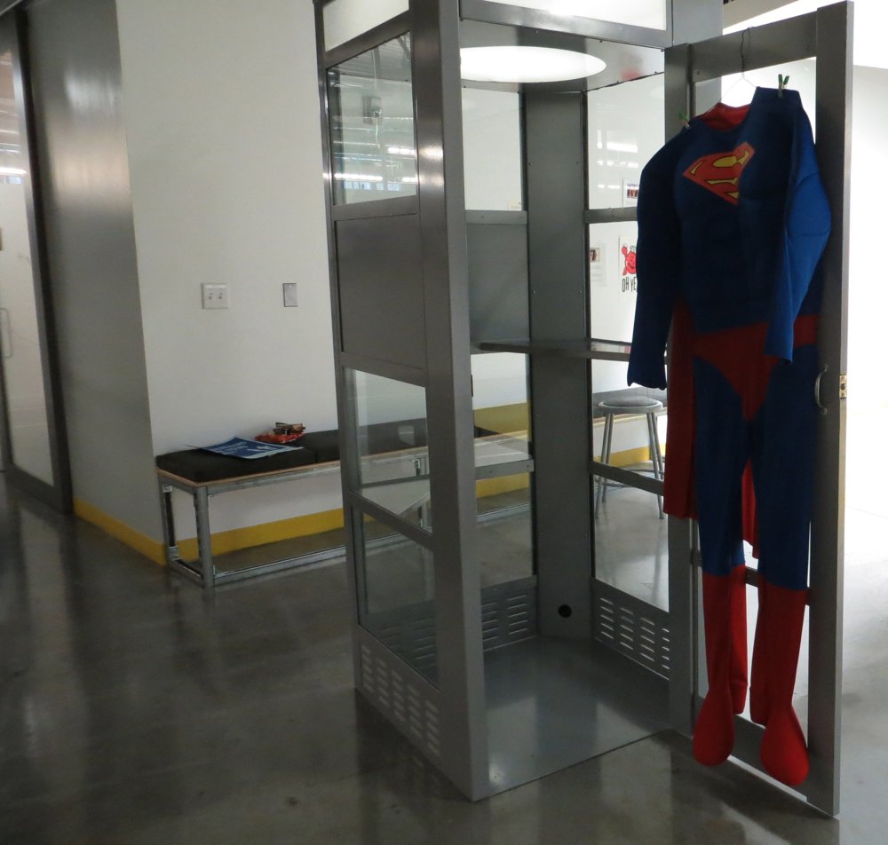 幽默几乎随处可见。我们在电话亭边有一件超人装。