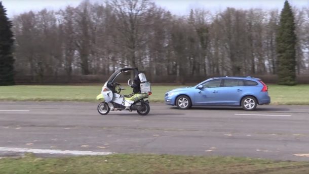 为了让自动驾驶汽车暴露在真实的环境中,而不让人类骑手处于危险之中,AB动力公司正在制造自动滑板车。自行车本身是一辆宝马C1踏板车。它的自动变速箱、ABS系统和防雨屋顶结构被选为首选。