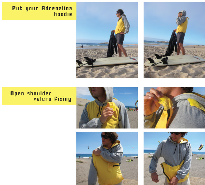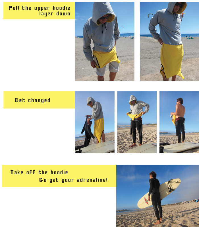 Adrenalina配备了两层衬衫,可以使骑自行车的人,冲浪者和运动员在旅途中进行变化。这个想法涉及利用衬衫的上层,通过将其挂在腰部下方,并让佩戴者在人群或海滩上换裤子,将其用作谦虚毛巾。