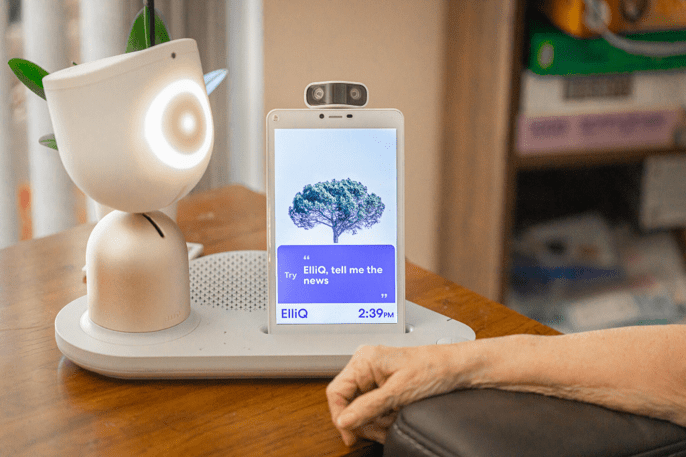 社交机器人ElliQ已经从事成千上万的与人类的相互作用,其中近一半交互专注于提供陪伴,一起享受一杯茶或咖啡等。越来越多的研究表明,伴侣机器人可以缓解压力,减少孤独,帮助老年人保持积极和健康的生活方式在他们的家园。