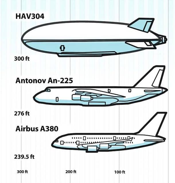 下面是Airlander 10的比较,最初命名为HAV304,也被称为飞行的屁股安-225和空客A380(其尺寸是标准A320的两倍):