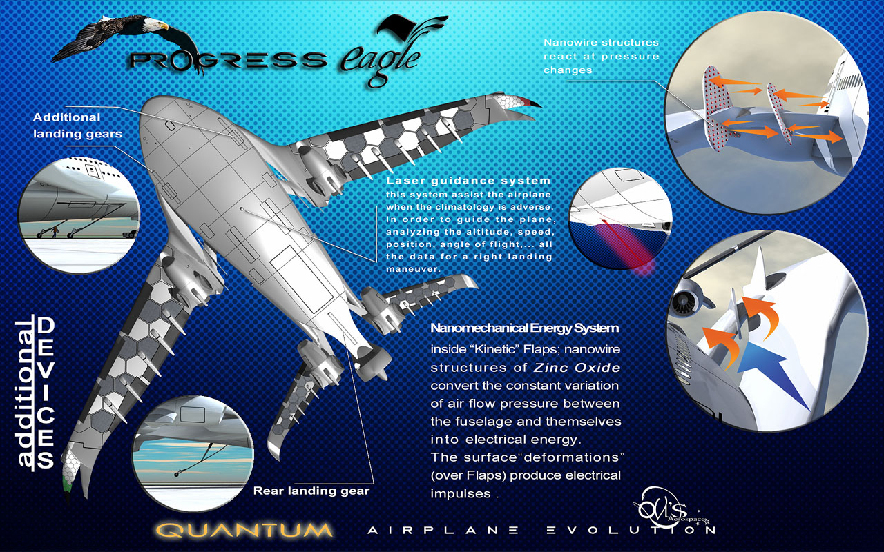 翼展应达到96米,同时可以部分折叠,以便飞机在机场时可以轻松操纵。Viñals先生说:“如果我们考虑到当前技术的发展和理论物理解决方案的未来进展,‘进步之鹰’是基于2030爱游戏ayx体育年以后的技术和量子力学的想法。今天,我们可以在世界各地最先进的实验室(大学、私人公司、政府机构)和最好的科学理论中找到这些技术。基于这些原因,“进步之鹰”所展现的创新可能在15年内就能实现。这个“超级喷气机”最相关的方面将与量子力学有更密切的关系,我们可以简化飞机的概念,就像一个“超级”能量粒子,具有比我们在今天的物理学中发现的更正统的特殊规格。