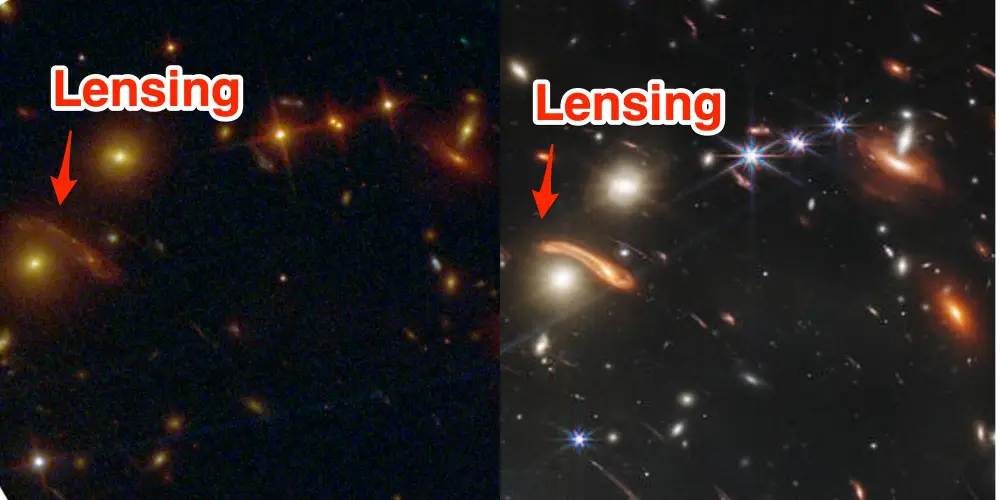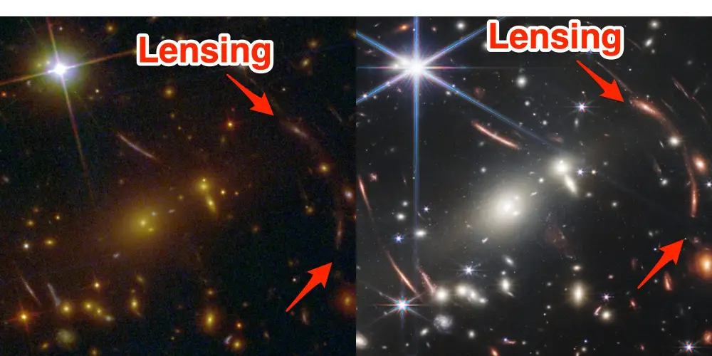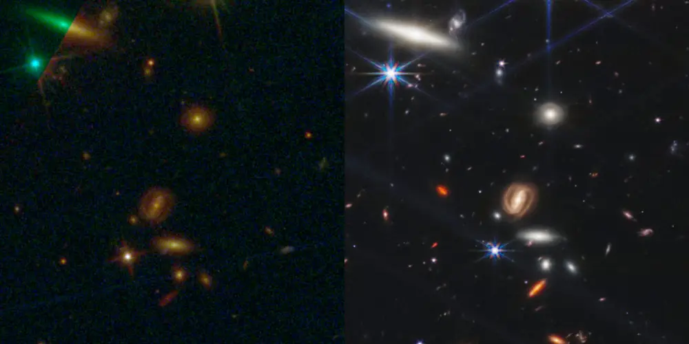 当您放大时,比较变得更加明显。下面的图像比较了SMACS 0723的Hubble和JWST重建,这是一个大约46亿年前出现的星系群。
