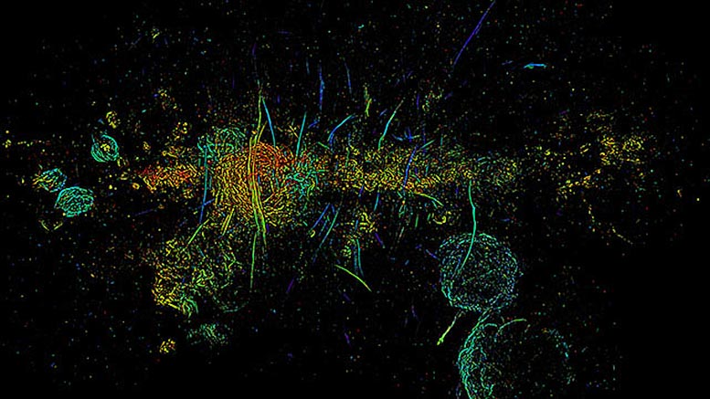 根据天体物理学家的说法,银河系中心无与伦比的新望远镜图像揭示了在太空中悬挂的近1000个神秘结构。南非的超敏感的Meerkat射电望远镜用于拍摄图像,并显示了磁丝的链。这些链成对和簇发现,并将其延伸至150光年。