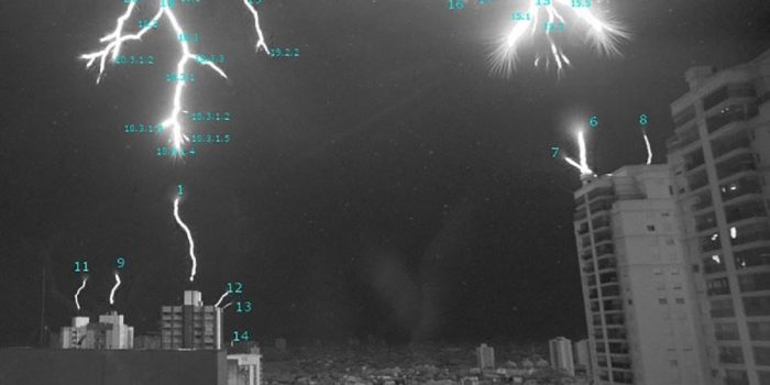 去年,巴西São José dos Campos的研究人员很幸运地捕捉到了几座建筑物的避雷针伸出来与空中下降的闪电相遇的瞬间。
