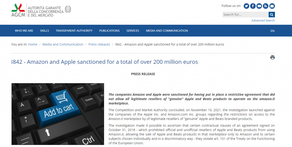 根据半岛电视台报道根据两家公司2018年达成的协议,只有少数经销商被授权在亚马逊上销售苹果和Beats的产品。AGCM从2020年开始进行反垄断调查,当时他们搜查了两家公司的办公室。据监管机构称,2018年,两家公司同意禁止在亚马逊意大利网站上转售苹果拥有的Beats产品。