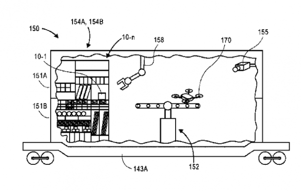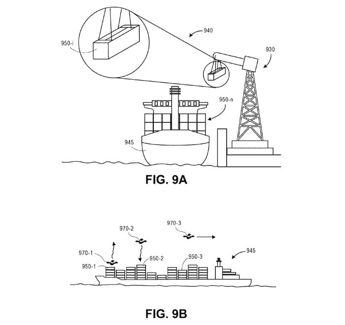 无人机的充电过程需要时间,如果其中任何一个需要在工作站进行维护,这需要大量的非生产性时间。因此,该专利提出了在火车、货车、船只、拖车和其他此类车辆上的移动车站设计。该设计要求一个标准尺寸的集装箱,在天花板上安装一个自动开口,用于发射无人机,并配备检索设备,其中“检索设备包括一个着陆面,配置为沿垂直轴升高或降低,并围绕垂直轴旋转。”