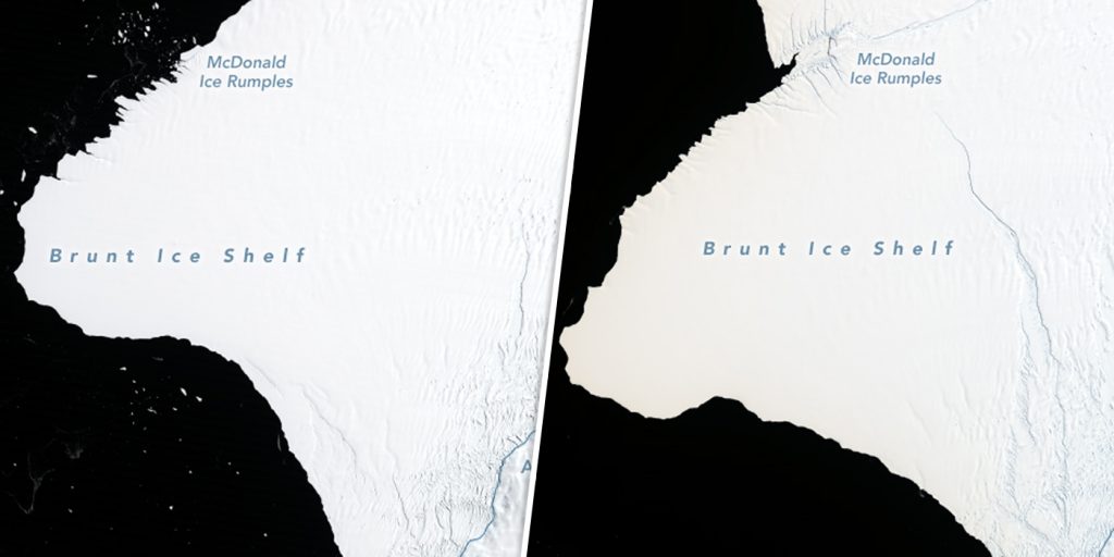 “(冰山)产犊后自然裂缝发展在过去的几年里扩展在整个冰架,“读取新闻稿英国南极调查局(BAS)捕获的图像的事件,导致新的冰山打破。“这不是第一次冲击冰架最近坏了。另一个巨大的,有点小,块冰断绝了相同的南极冰架在2021年,一个事件,科学家说气候变化与我们无关。