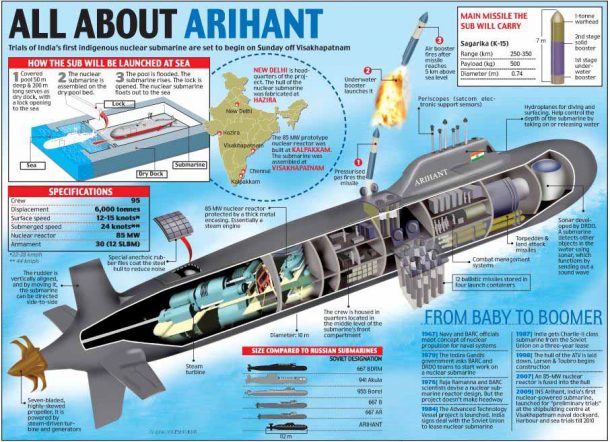 印度对核武器采取“不首先使用”政策,并承诺只在受到核武器攻击时使用核武器。它是世界上第六个在海上部署弹道武器的国家。这一战略被称为持续海上威慑,包括美国在内的几个国家都采用了这一战略。它只需要一艘随时在海上部署核导弹的潜艇就能击退突然袭击。