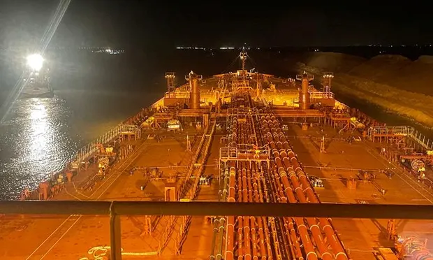 亲和力V为820英尺(250 m),长147英尺(45 m)宽油轮。它重64,000吨,由一家新加坡公司拥有。它从葡萄牙航行,前往沙特阿拉伯红海的扬布港。