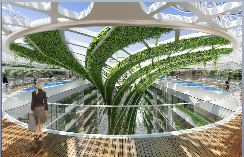 大型的树木将提供自然通风和消耗的二氧化碳。复杂的也将部分由风能和太阳能。